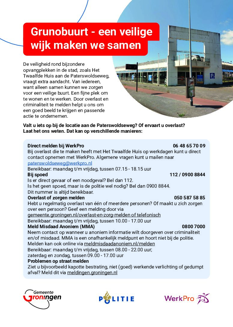 De bezoekers konden een flyer meenemen met overzichtelijke informatie en contactgegevens voor een veilige buurt, gemaakt in samenwerking met gemeente Groningen.